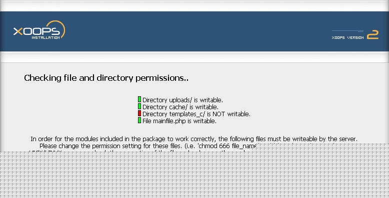 If you see this screen while installing, congratulations! You have the writing permits okay, and you're set to continue installing XOOPS. To do so, click again in the button labeled . And to continue with this guide, see Chapter 4, General configuration.